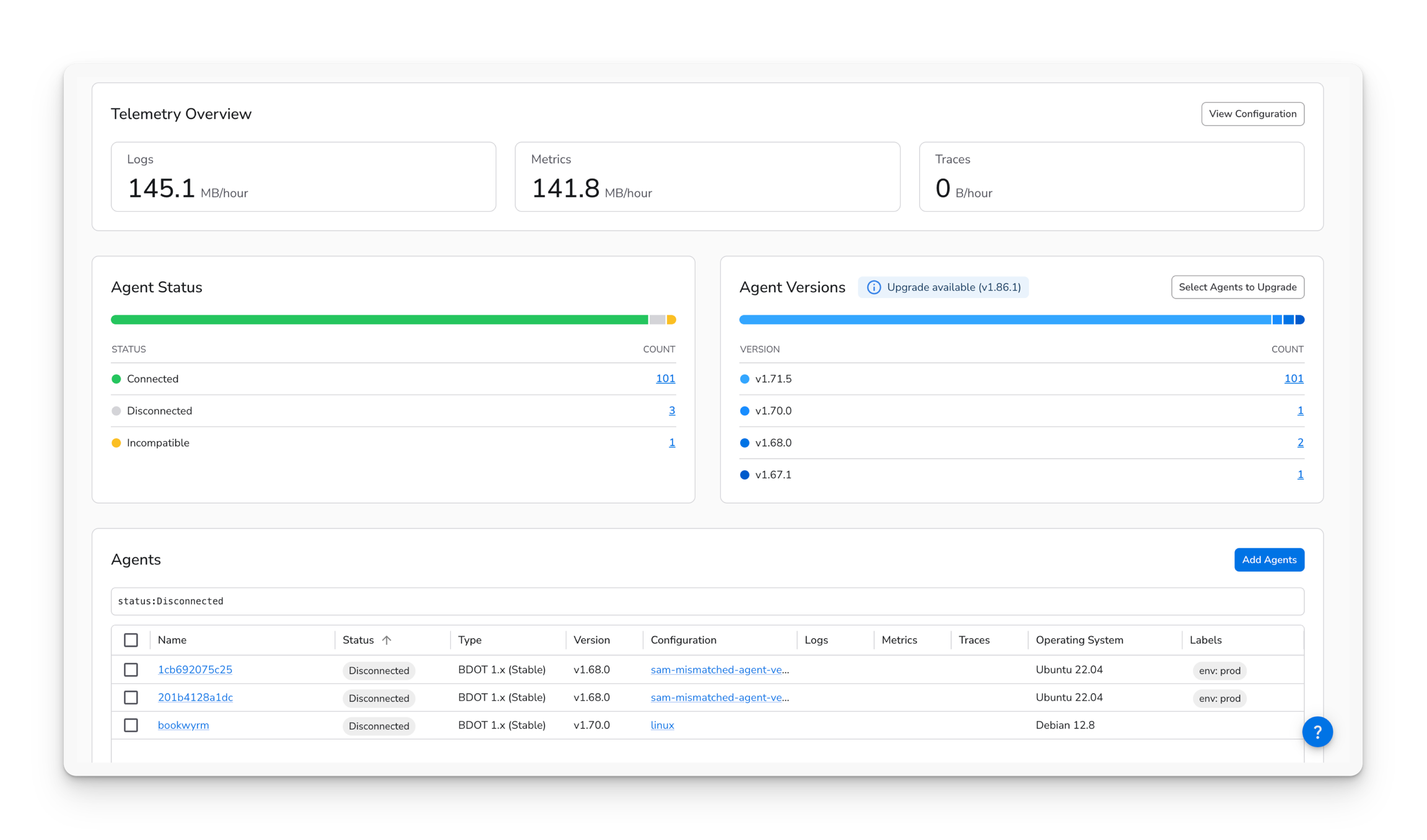The Fleet page includes agent health and telemetry insights to help you understand the overall state of your fleet.