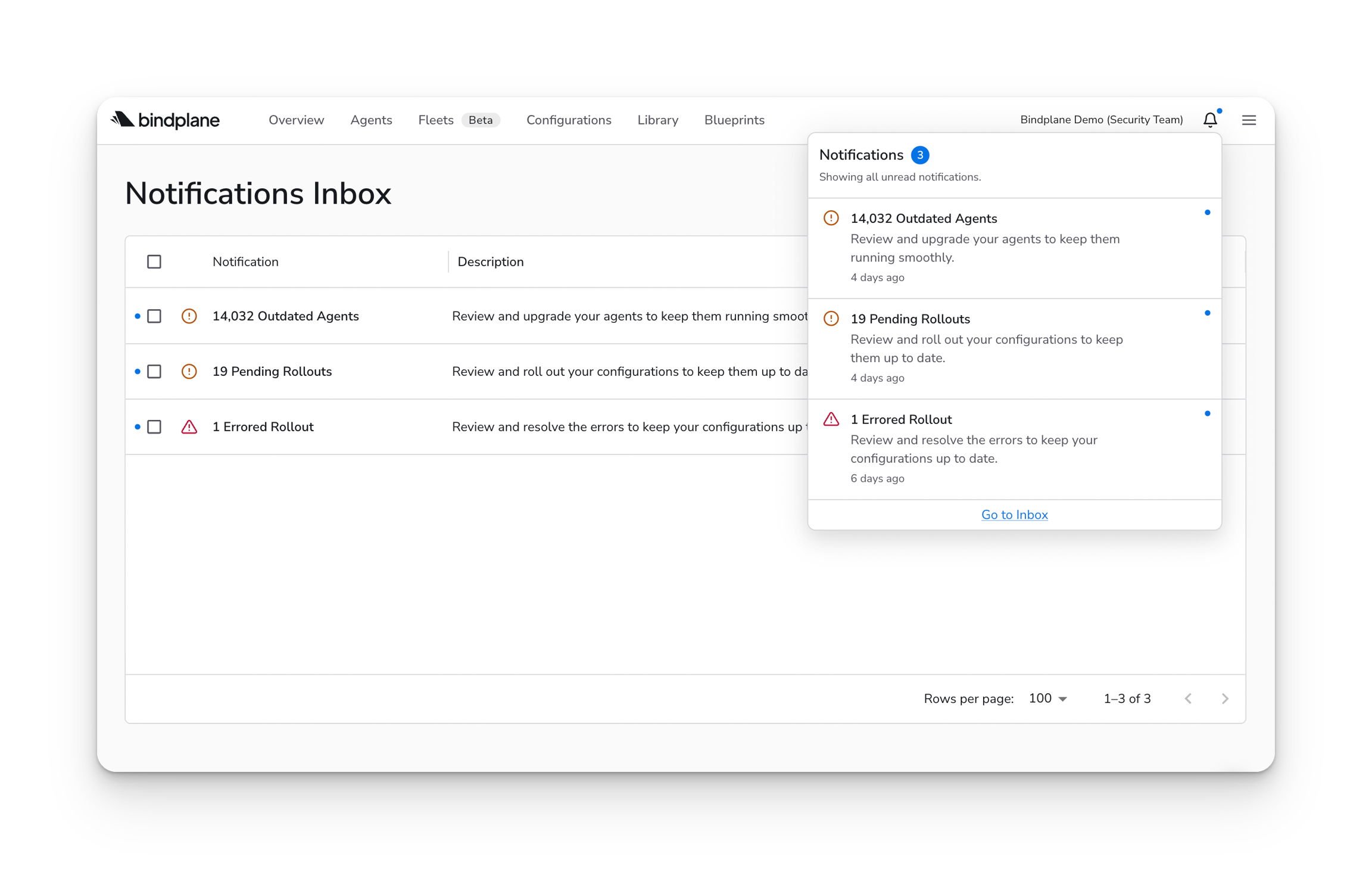 Bindplane automatically generates notifications on a daily basis based on your project and organization state. These notifications help you monitor the health and status of your Bindplane deployment:
