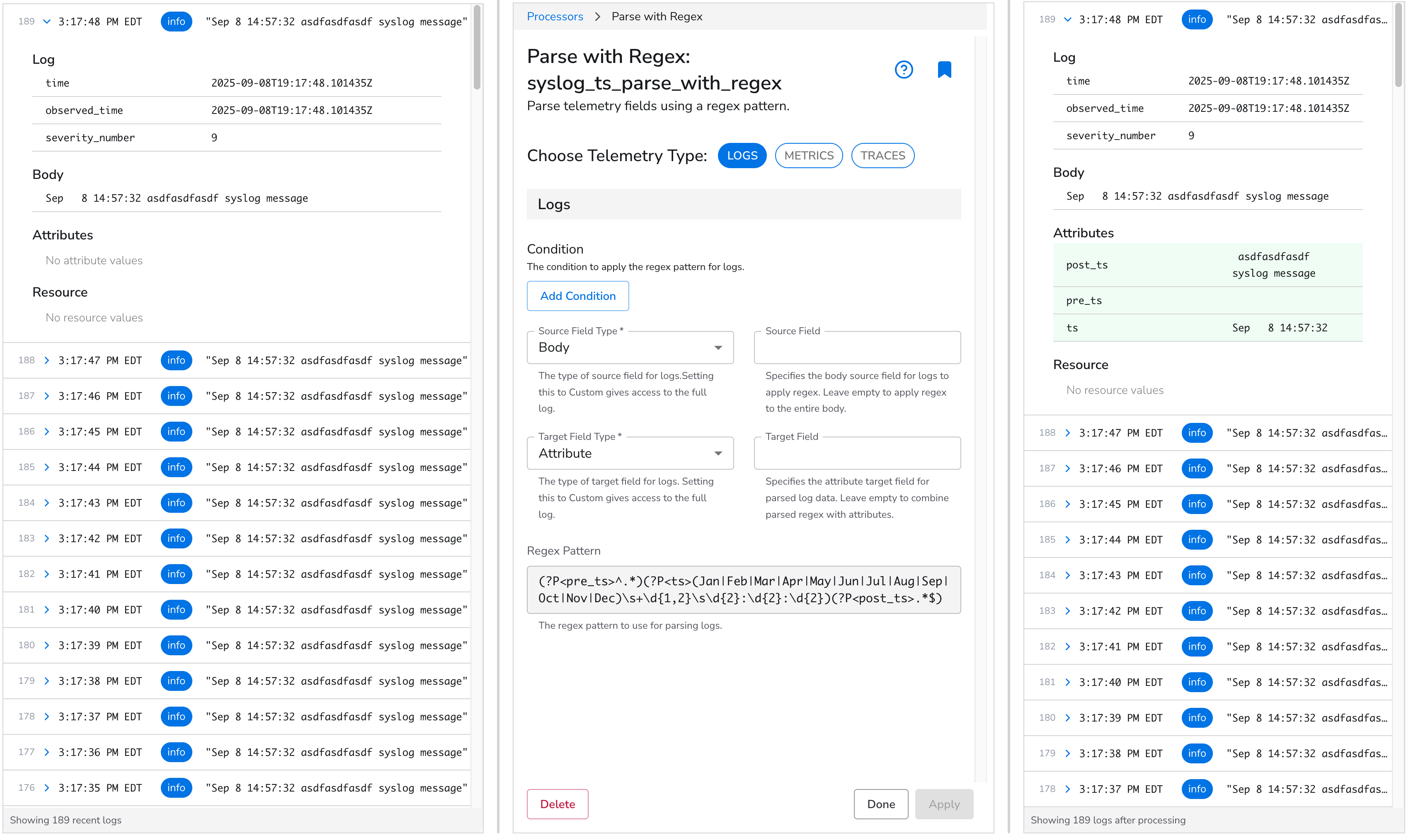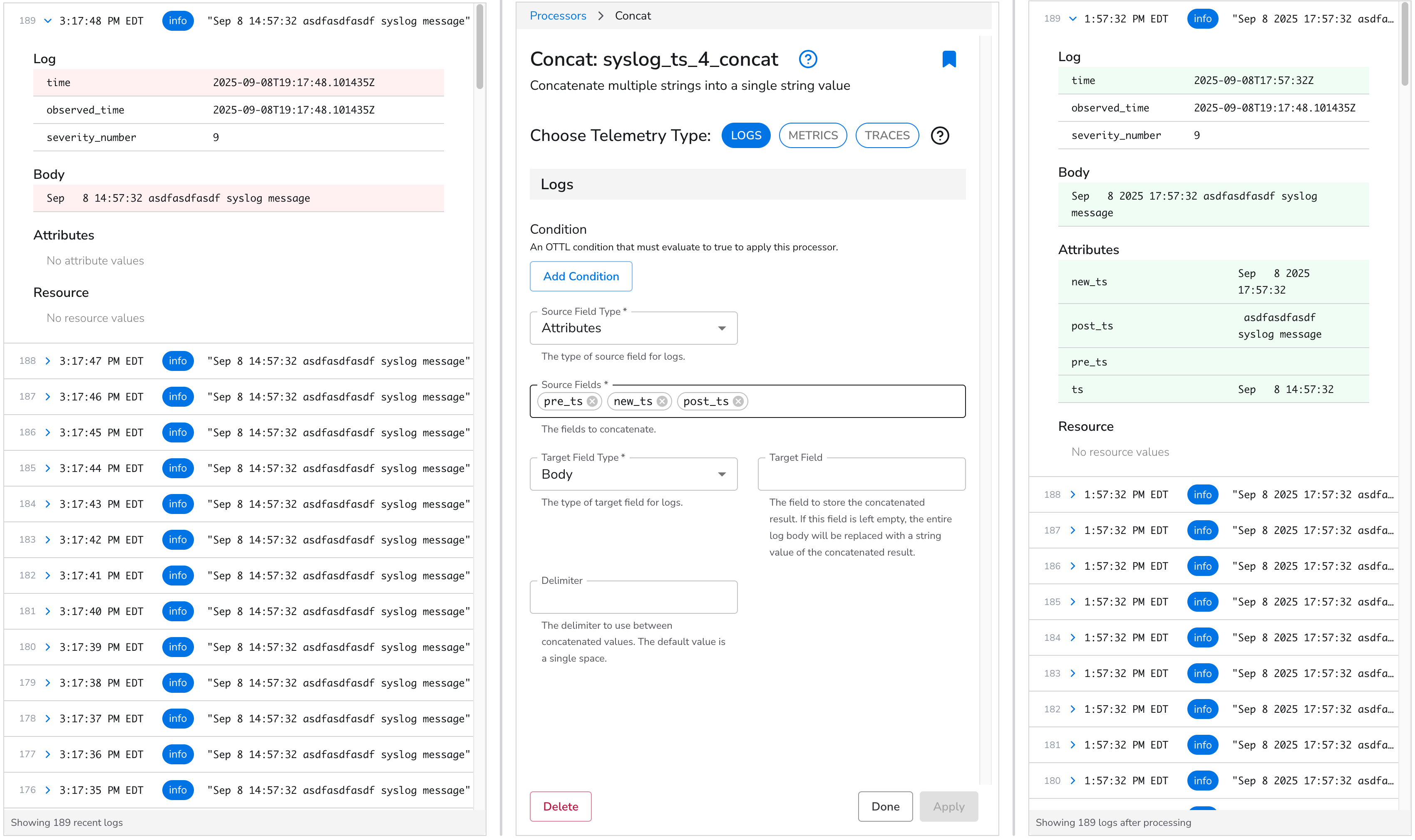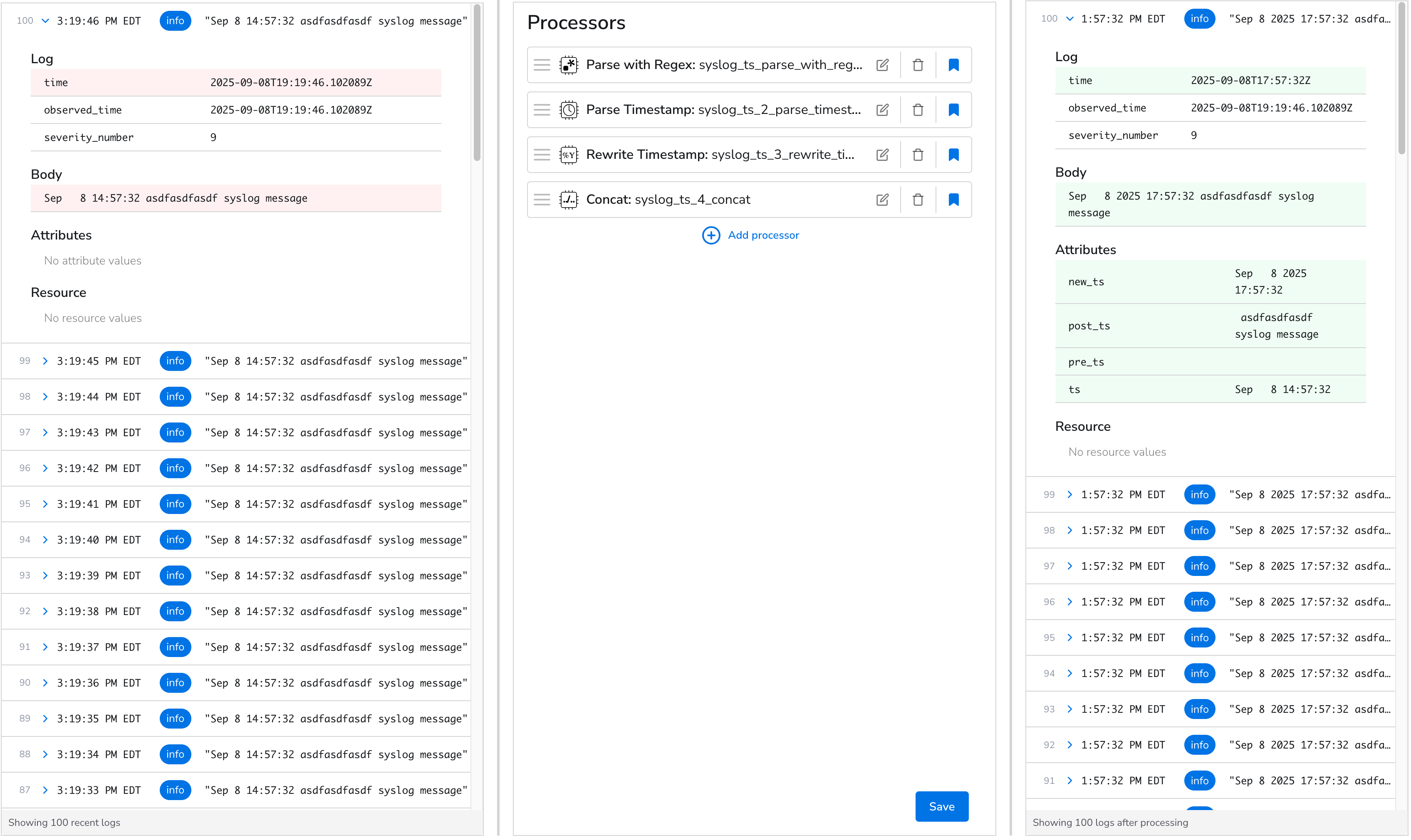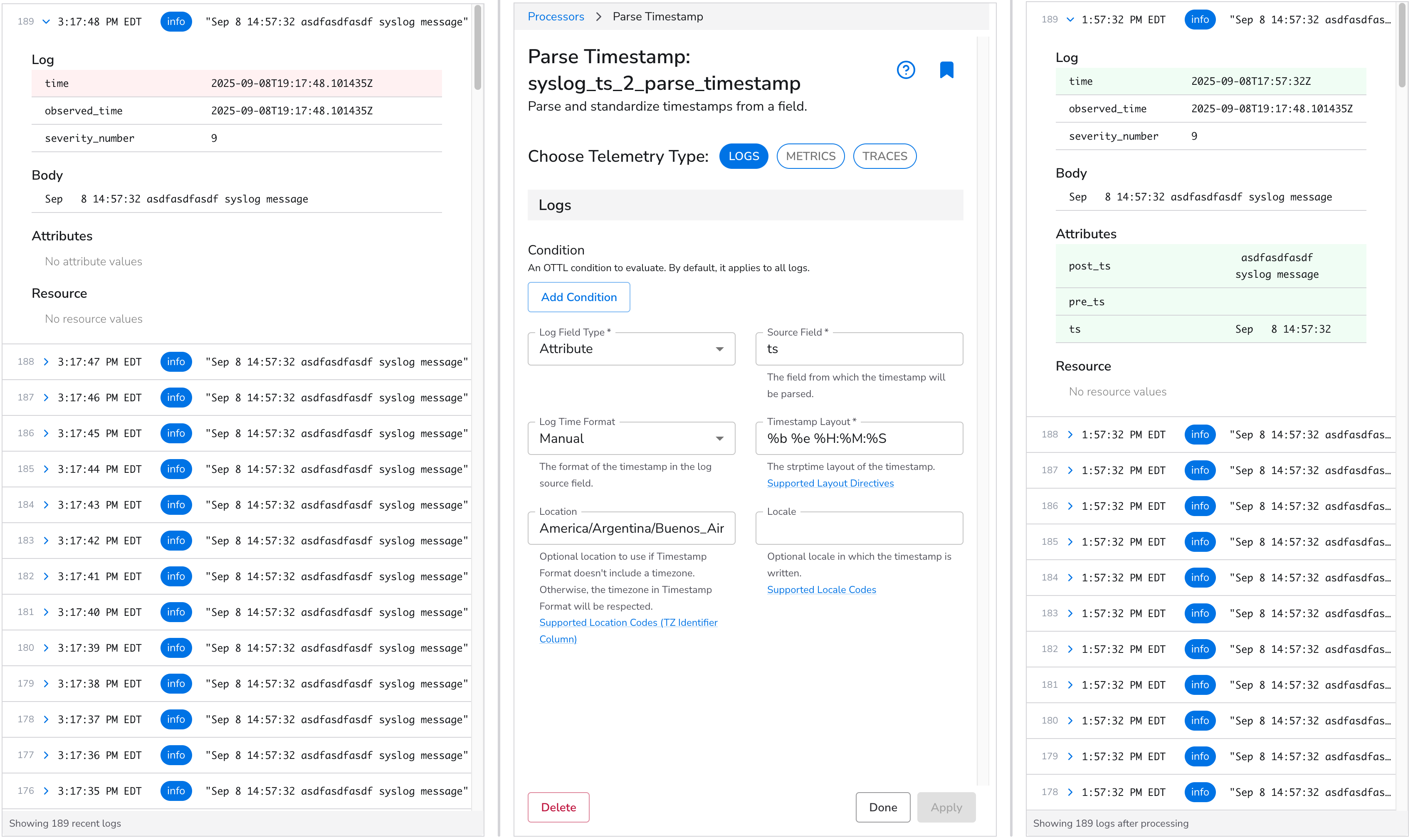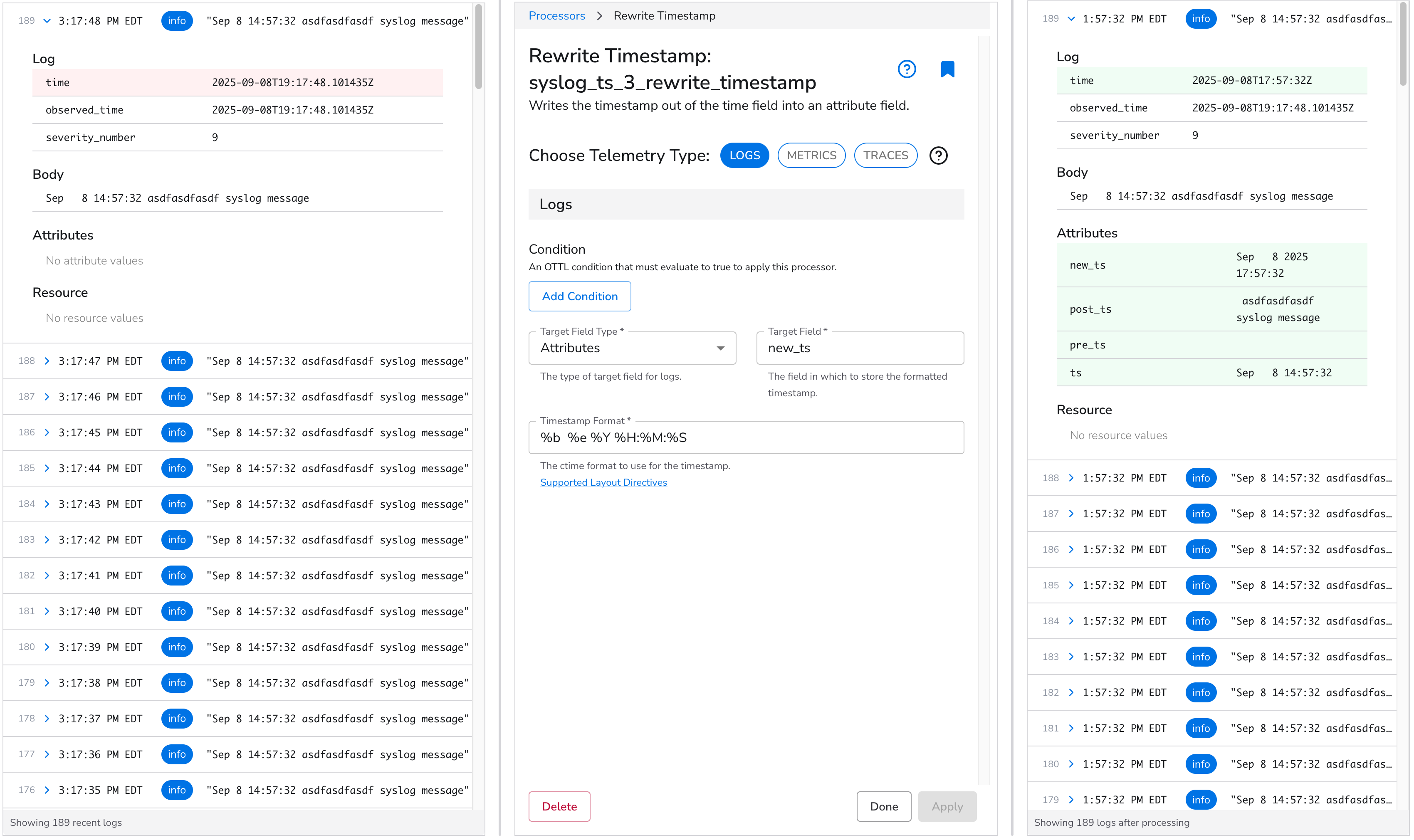 We will now utilize the [Broken link](https://docs.bindplane.com/how-to-guides/broken-reference "mention") processor to generate a field `attribute.new_ts`. This field's value will convert `log.time` into a UTC timestamp while maintaining the original log's format.