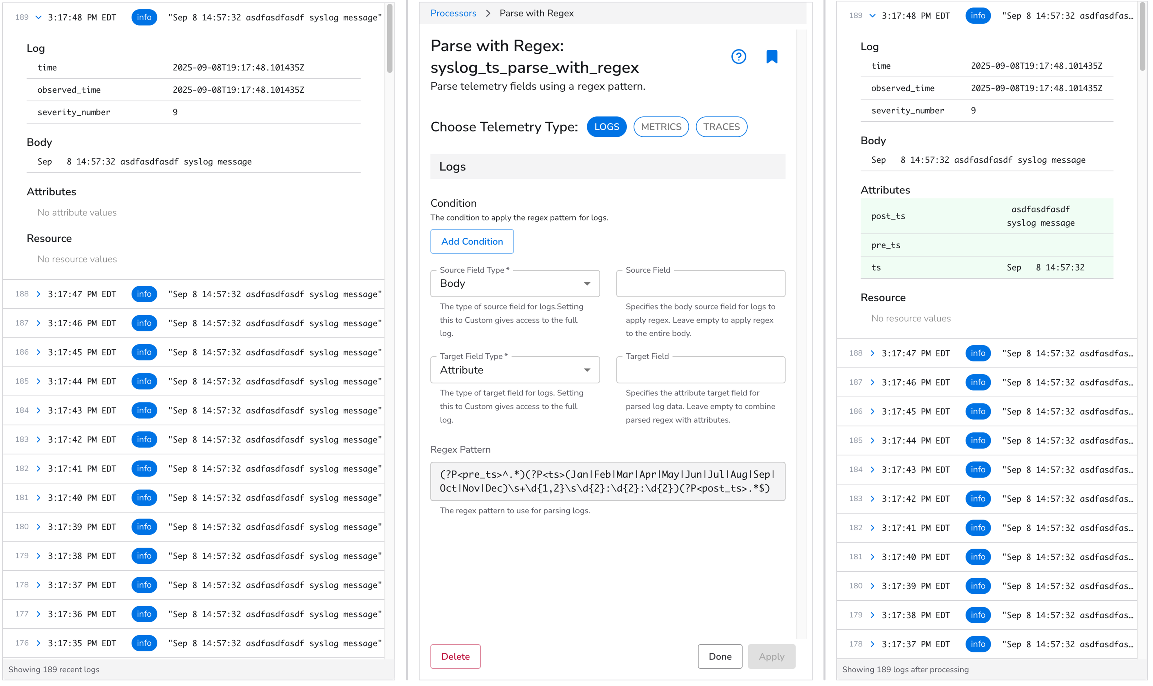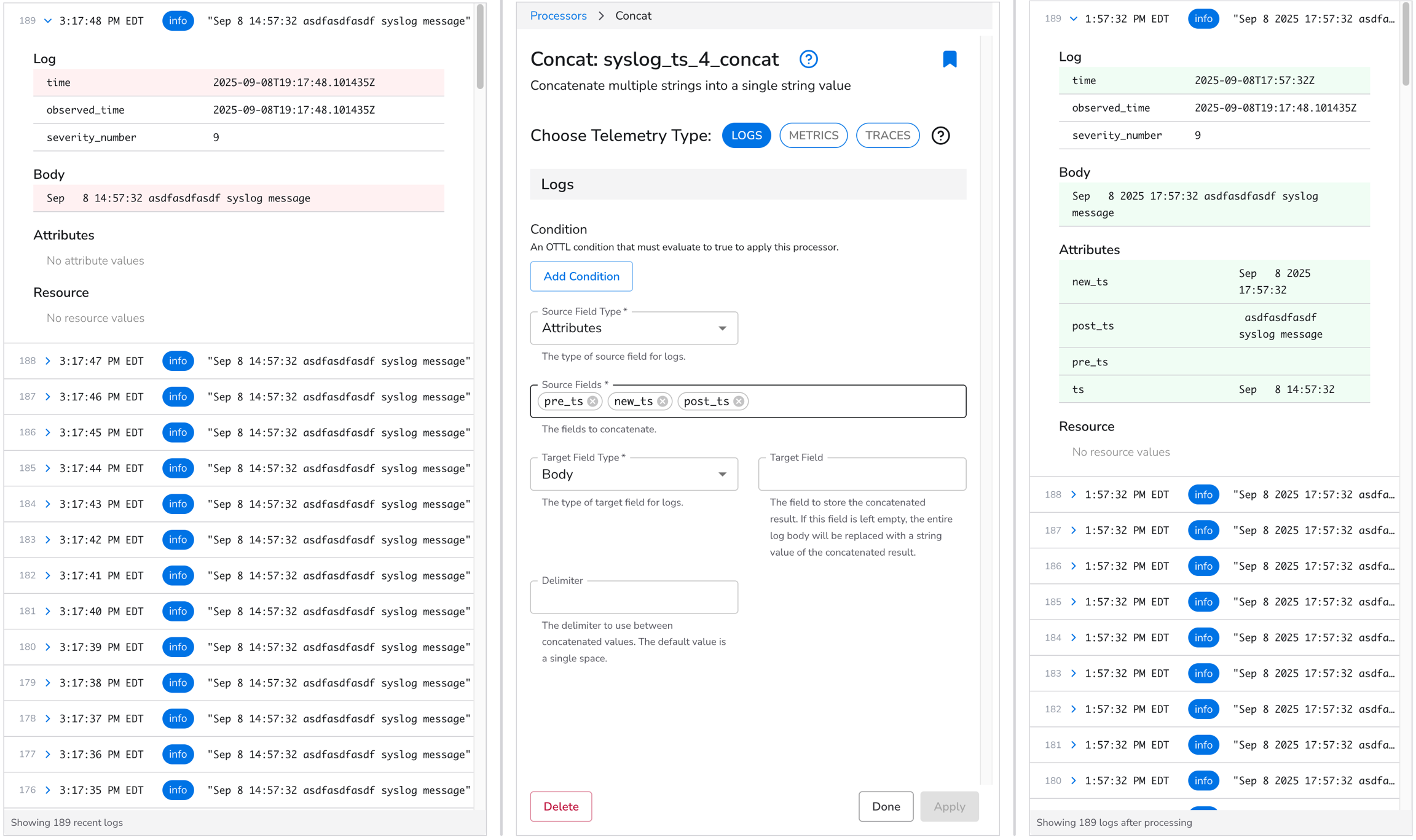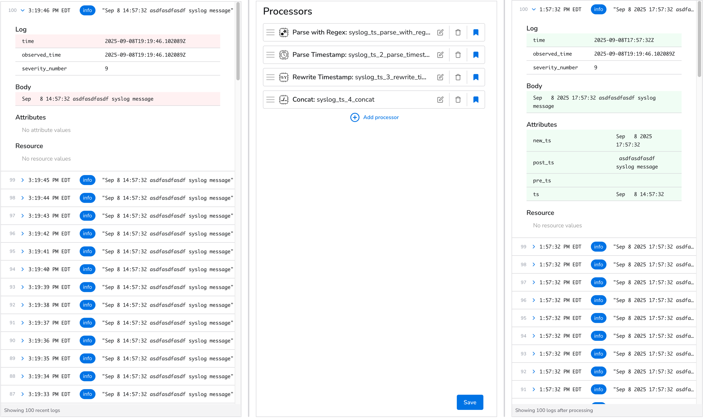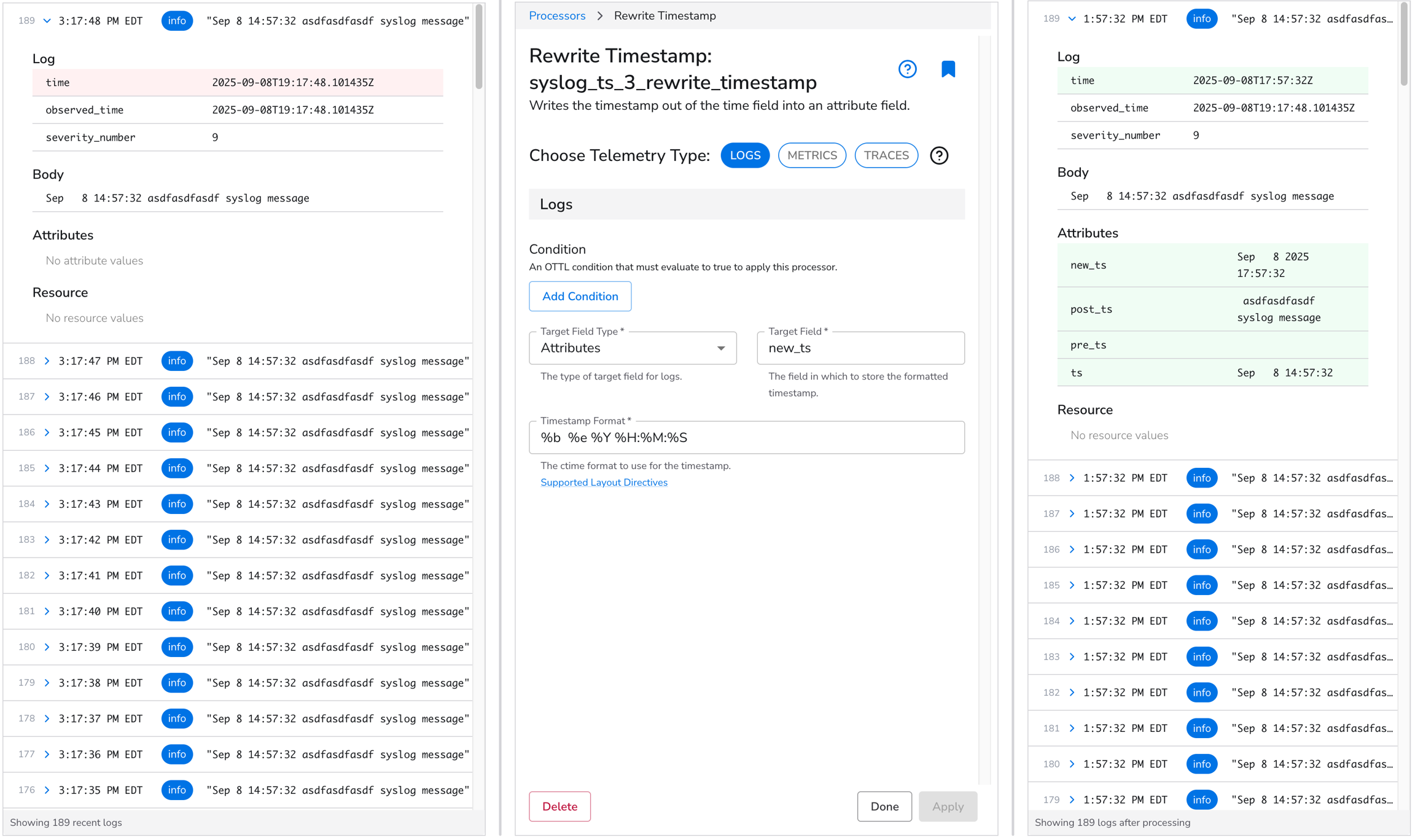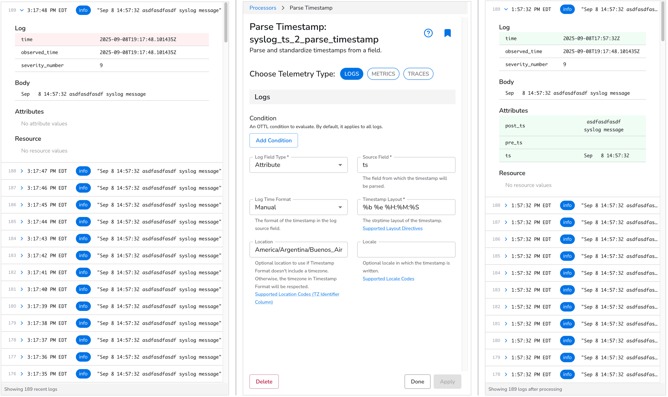 This guide provides a step-by-step process to modify timestamps within log bodies to ensure correct ingestion. The example used here demonstrates converting timestamps to a UTC-3 timezone.
